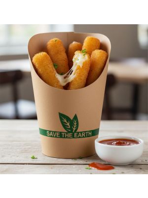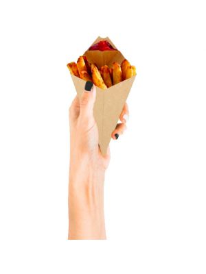 Aunque son perfectos para servir patatas fritas, nuestros cucuruchos de cartón son igualmente adecuados para una variedad de fritos. Su diseño resistente asegura que pueda utilizarlos para todo tipo de bocados crujientes, desde aros de cebolla hasta tempuras, ofreciendo una presentación impecable y práctica.
